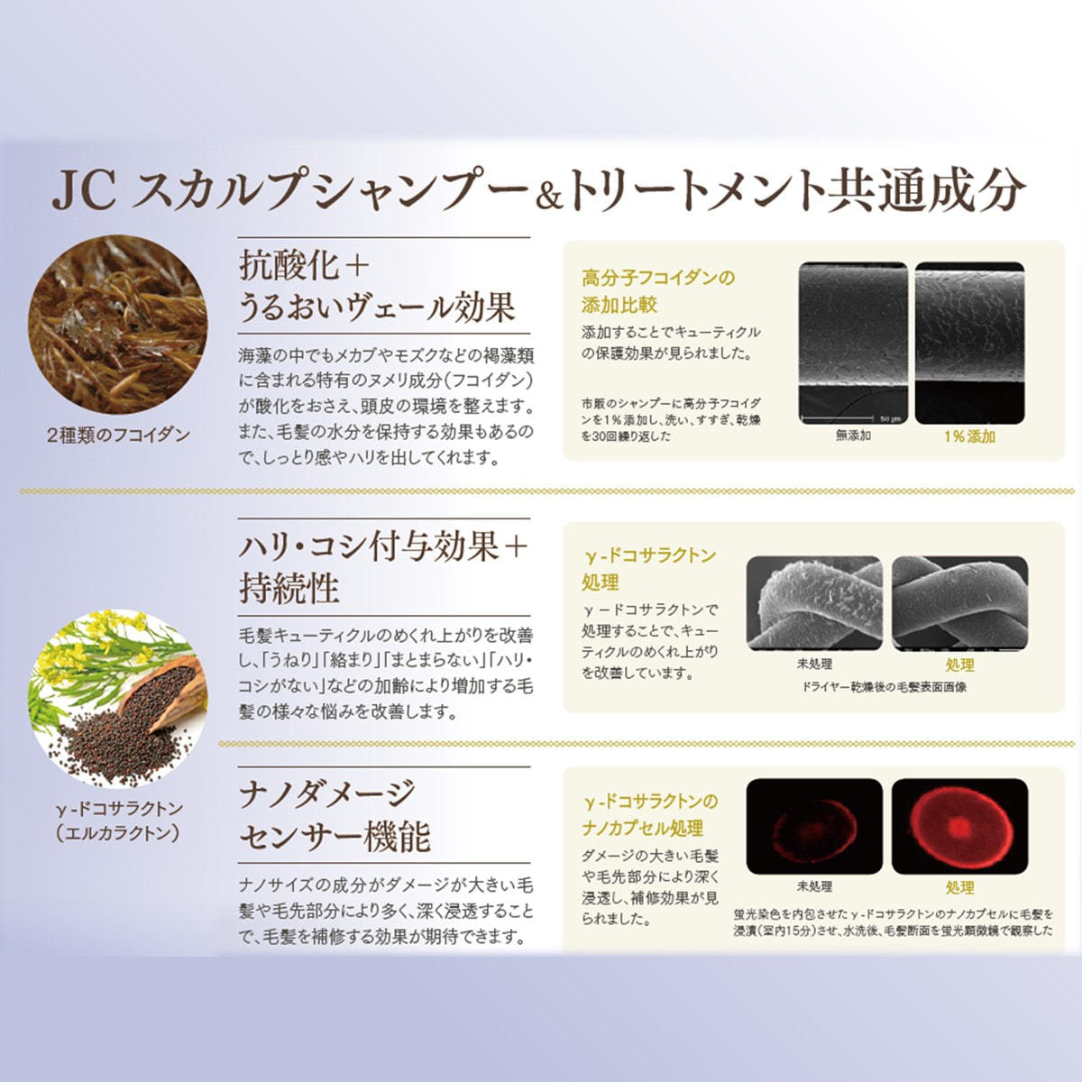 水、クラドシホンノバエカレドニアエエキス、クラドシホンノバエカレドニアエ多糖体、グルタミン酸、アルニカ花エキス、イタリアイトスギ葉/実/茎油、セタノール、加水分解ケラチン、水添レシチン、アラニン、ローズマリー葉エキス、ヒノキ油、ベヘントリモニウムクロリド、ラノリン脂肪酸、ベタイン、アルギニン、ローマカミツレ花エキス、ビターオレンジ花油、シクロペンタシロキサン、γ-ドコサラクトン、酢酸、リシン、ユズ果実エキス、エチルヘキシルグリセリン、グリセリン、フィトステロールズ、PCA-Na、トレオニン、セイヨウキズタ葉/茎エキス、ペンチレングリコール、イソプロパノール、BG、プロパンジオール、プロリン、オドリコソウ花エキス、フェノキシエタノール、ステアリン酸グリセリル(SE)、ジメチコン、酢酸N a、クララ根エキス、ゴボウ根エキス、アモジメチコン、ステアルトリモニウムクロリド、ソルビトール、オタネニンジン根エキス、セイヨウアカマツ球果エキス、べヘニルアルコール、PEG-2オレアンモニウムクロリド、クオタニウムー18、センブリエキス、ユーカリ葉油、コカミドプロピルベタイン、セテアレスー13、セリン、オランダガラシ葉/茎エキス、ティーツリー葉油、酢酸トコフェロール、セテアレス−7、グリシン、ニンニク根エキス、ベルガモット果実油