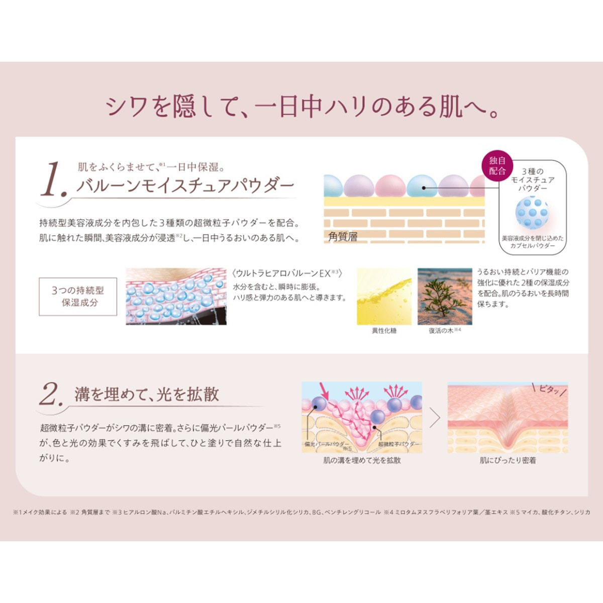 水、シクロペンタシロキサン、酸化チタン、BG、エチルヘキサン酸セチル、トリメチルシロキシケイ酸、グリセリン、PEG-10ジメチコン、硫酸Ba、酸化亜鉛、セチルPEG/PPG-10/1ジメチコン、セスキイソステアリン酸ソルビタン、パルミチン酸、水酸化Mg、ポリメチルシルセスキオキサン、シルク、加水分解シルク、ヒアルロン酸Na、異性化糖、ミロタムヌスフラベリフォリア葉/茎エキス、カラスムギ穀粒エキス、オランダセンニチ花エキス、ビオサッカリドガム-1、シロキクラゲ多糖体、ユビキノン、水溶性プロテオグリカン、グリチルリチン酸2K、ツボクサエキス、スクワラン、アルガニアスピノサ核油、ホホバ種子油、フユボダイジュ花エキス、シリカ、アルミナ、マイカ、ジグリセリン、プロパンジオール、ペンチレングリコール、ステアリン酸、パルミチン酸エチルヘキシル、トリ(カプリル酸/カプリン酸)グリセリル、エチルヘキシルグリセリン、炭酸プロピレン、ハイドロゲンジメチコン、セスキオレイン酸ソルビタン、ジステアルジモニウムヘクトライト、ジメチルシリル化シリカ、硫酸Mg、水酸化Al、フェノキシエタノール、エチルパラベン、ジミリスチン酸Al、タルク、酸化鉄