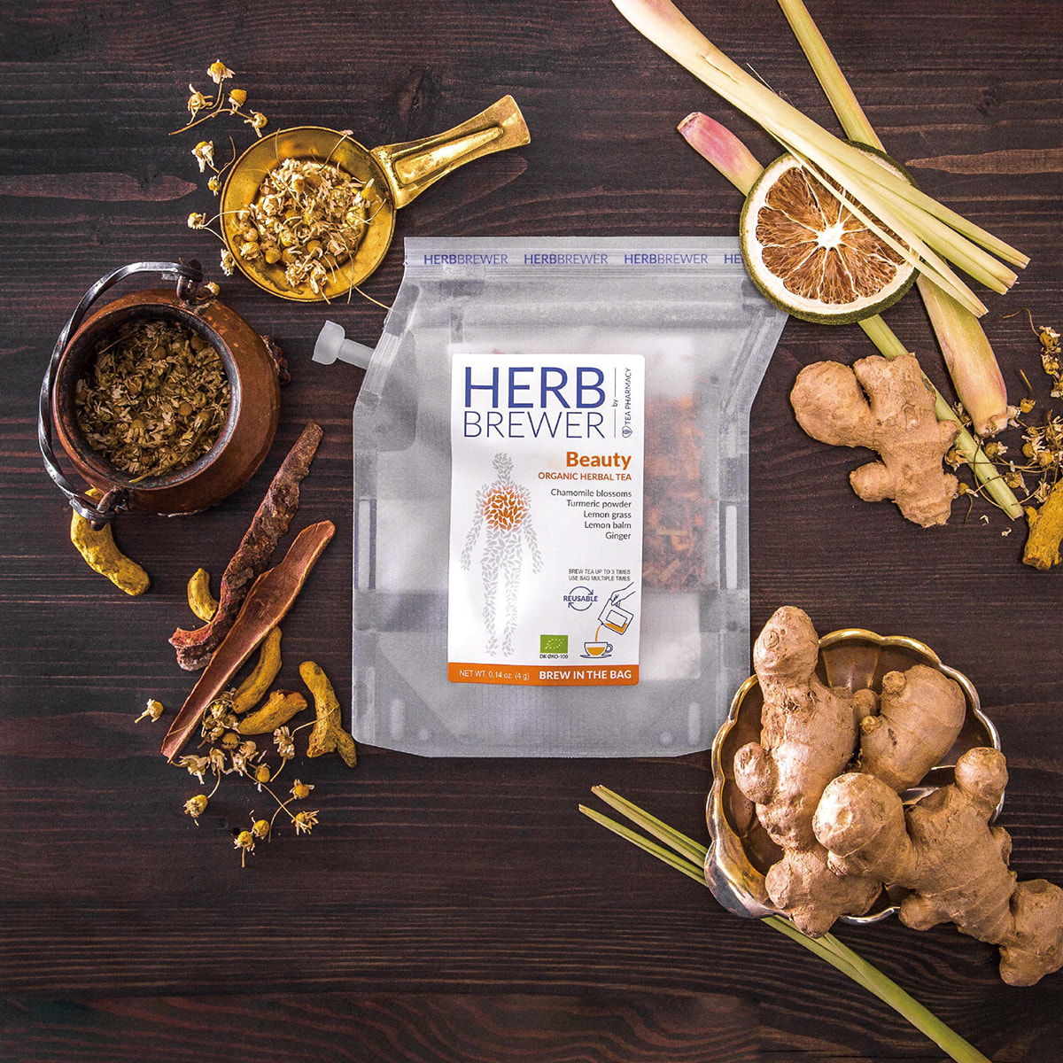 有機ジンジャー、有機レモングラス、有機レモンバーベナ、有機レモンバーム、有機シナモン、有機カモミール、有機ターメリックパウダー、有機グローブ、ジンジャーオイル
