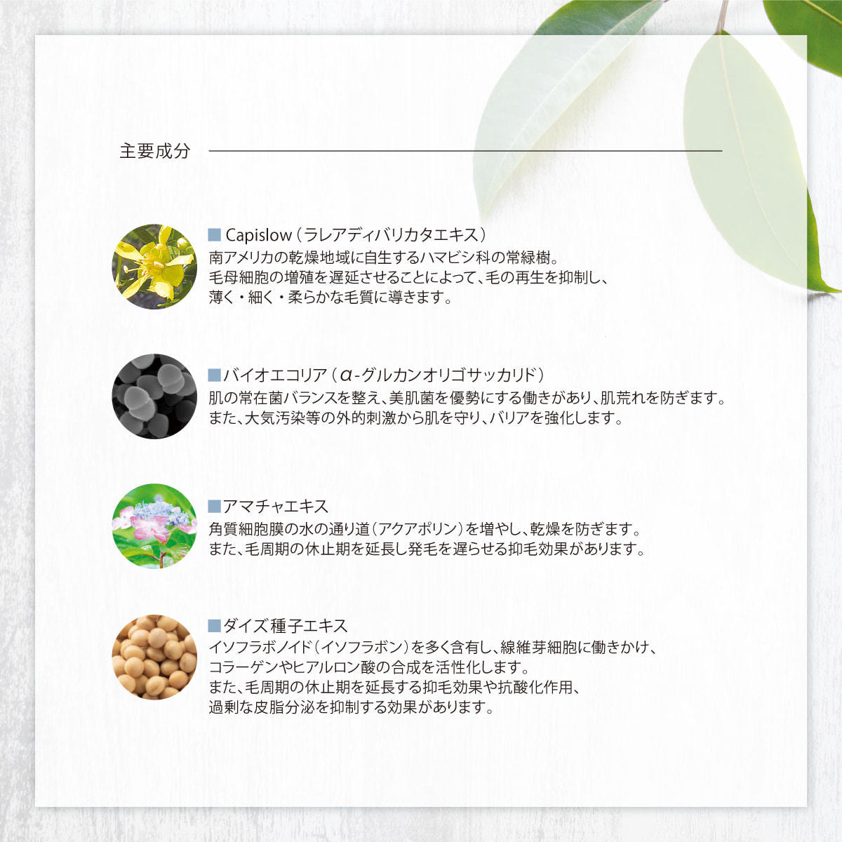 また、毛周期の休止期を延長し発毛を遅らせる抑毛効果があります。