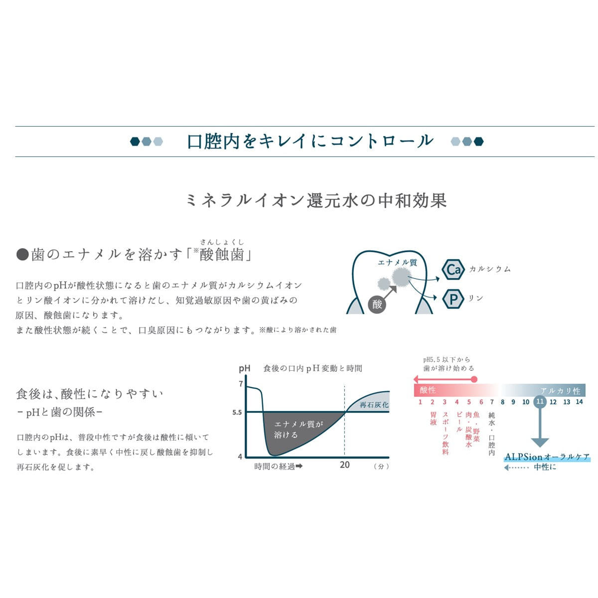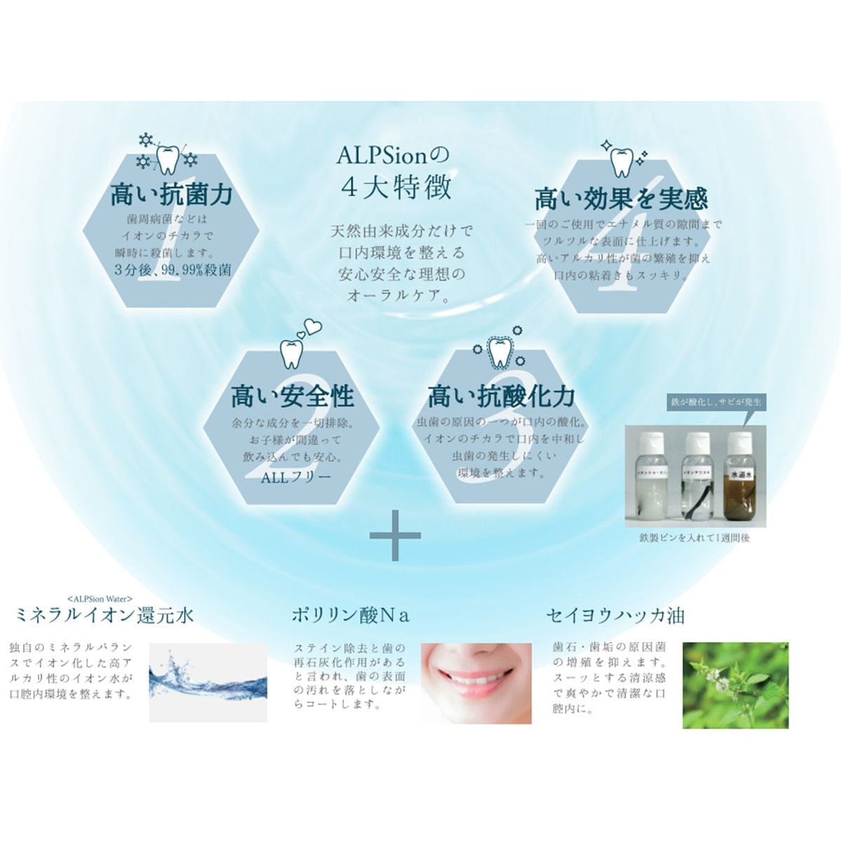 独自のミネラルバランスでイオン化した高アルカリ性のイオン水が口腔内環境を整えます。
