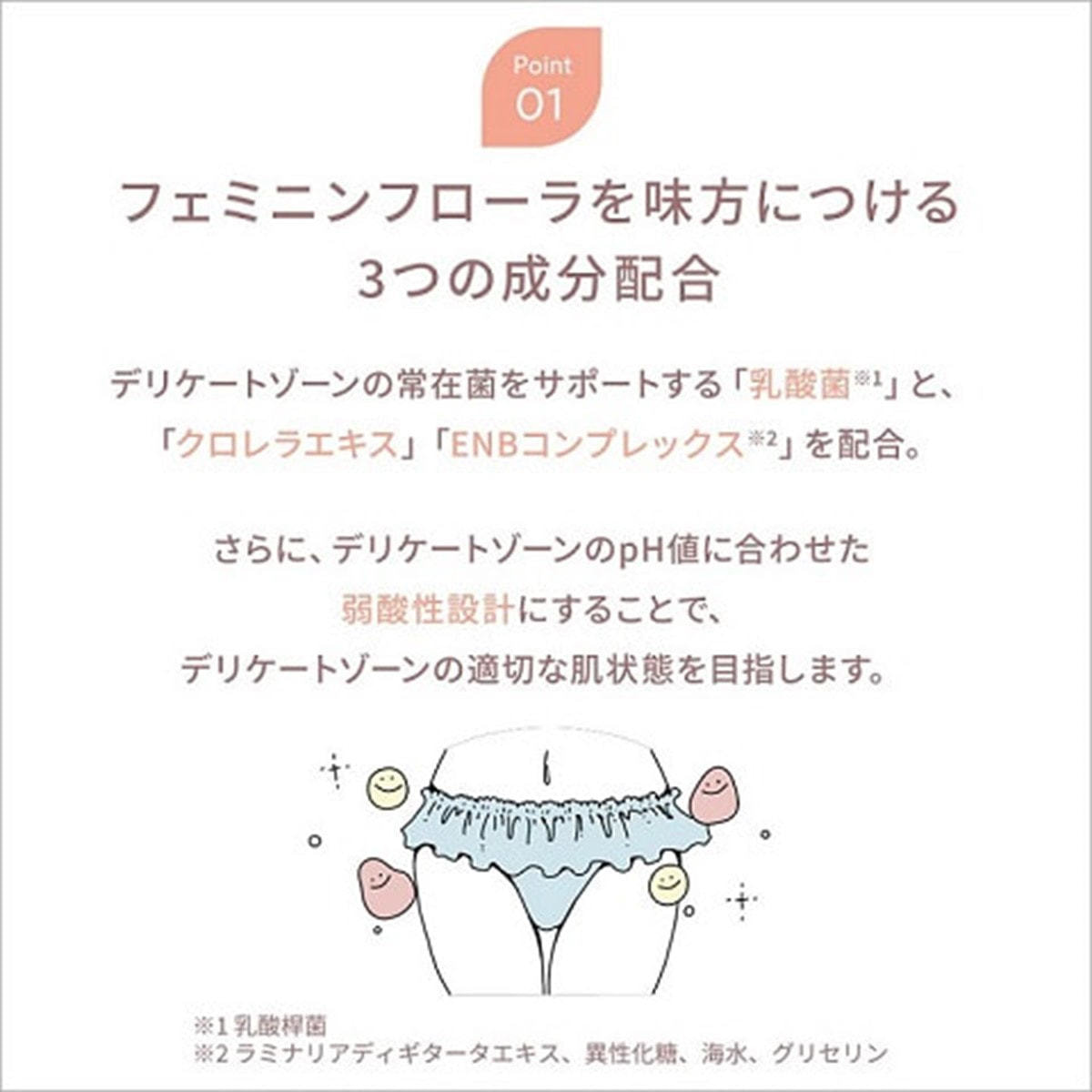 さらに、デリケートゾーンの常在菌をサポートする「乳酸菌※1」と、「クロレラエキス」「ENBコンプレックス※2」を配合し、デリケートゾーンのpH値に合わせた弱酸性設計にすることで、デリケートゾーンの適切な肌状態を目指します。