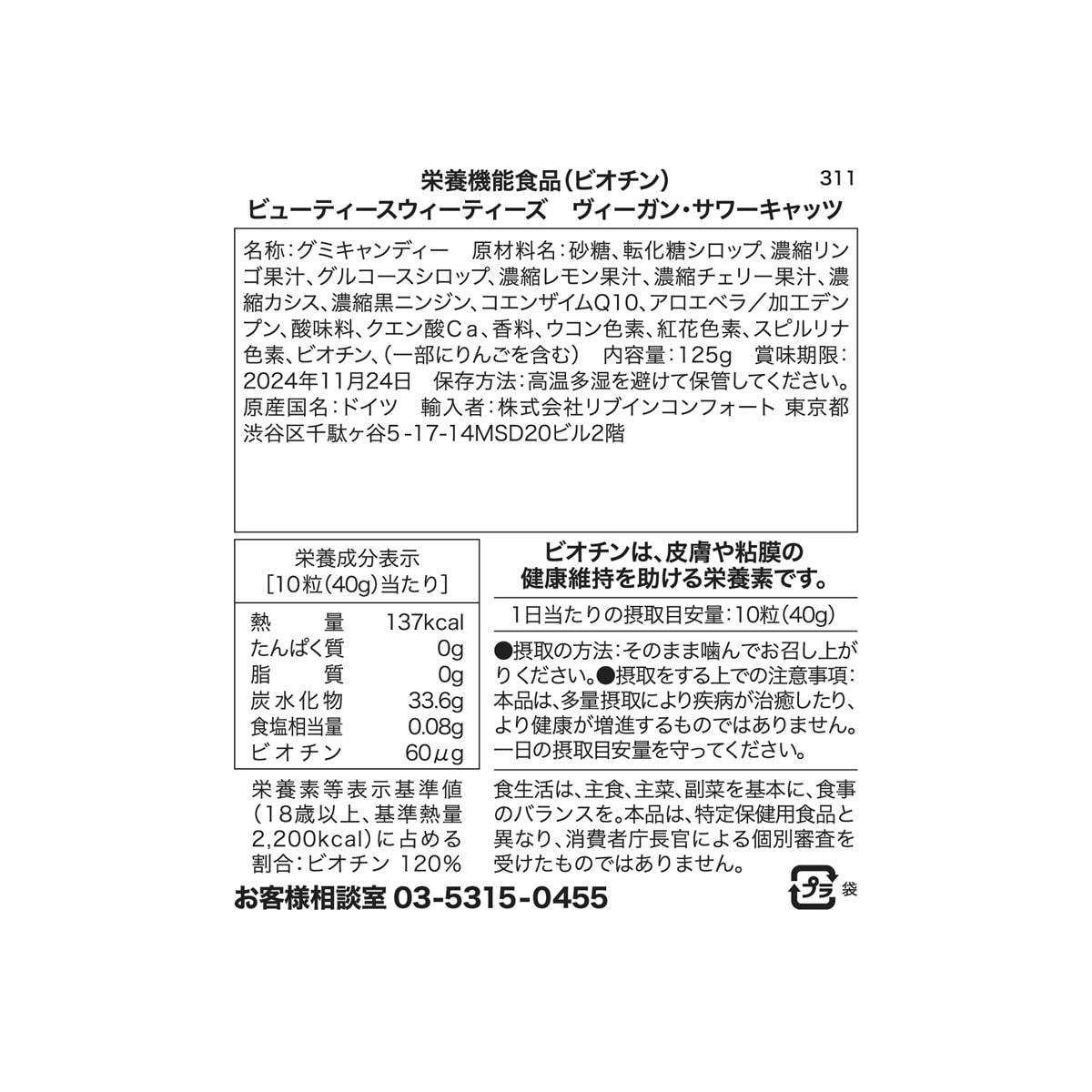 商品名:ビューティースウィーティーズ ヴィーガン・サワーキャッツ 125g【栄養機能食品】