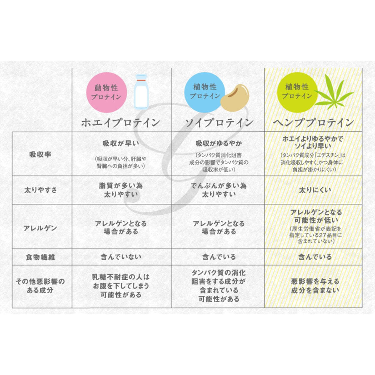 エデスチン(edestin)は麻の実だけに含まれる特有のプロテインで、ホエイプロテインと比べて身体への負担が少なく、消化しやすく吸収しやすい事から、アスリートからご高齢の方、もちろん小さなお子さんにもオススメのプロテインとして注目されています。