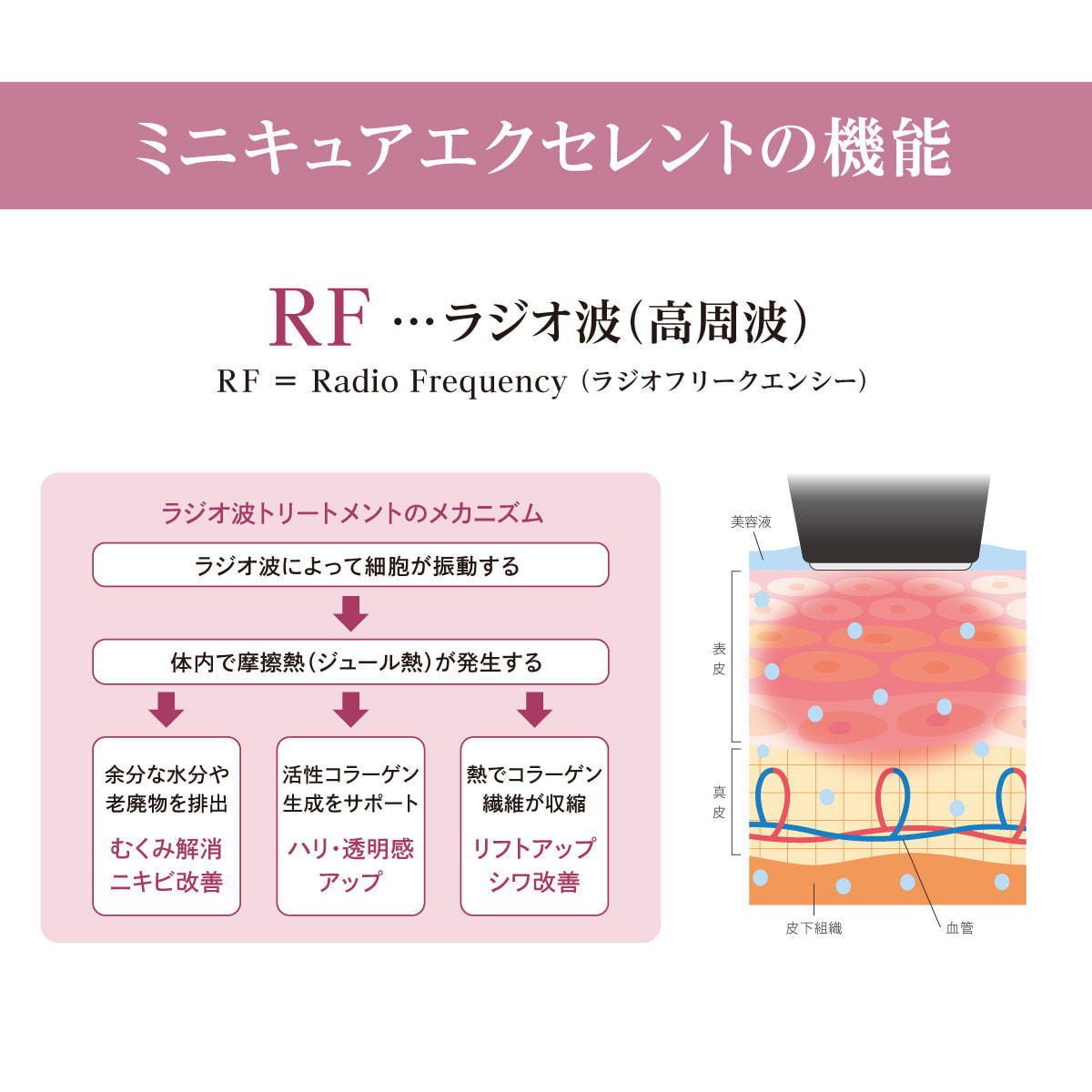 安定した質の高いラジオ波を高速で出力することにより、肌深部の細胞同士を震わせて摩擦熱を起こし、効率的にコラーゲンの生成を促し、たるみ解消・引き締め効果を発揮します。