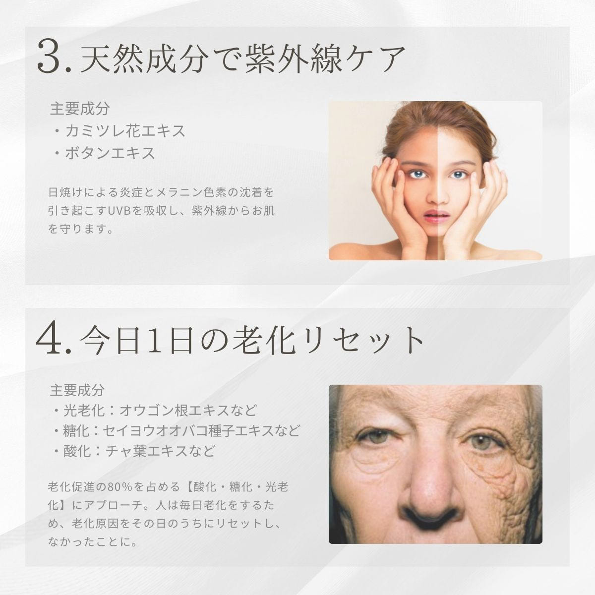 潤い不足やストレス、紫外線による肌老化にアプローチ。