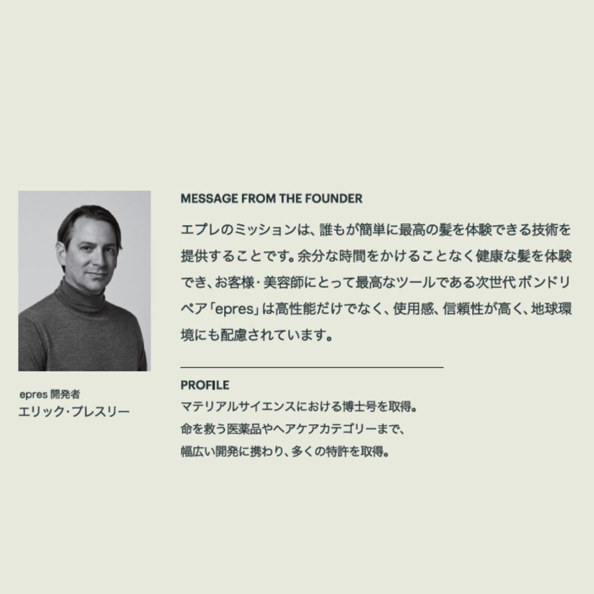 毛髪化学界の天才化学者エリック・プレスリー氏が生み出した結合補修トリートメントで、美髪ケアを体験いただけます。