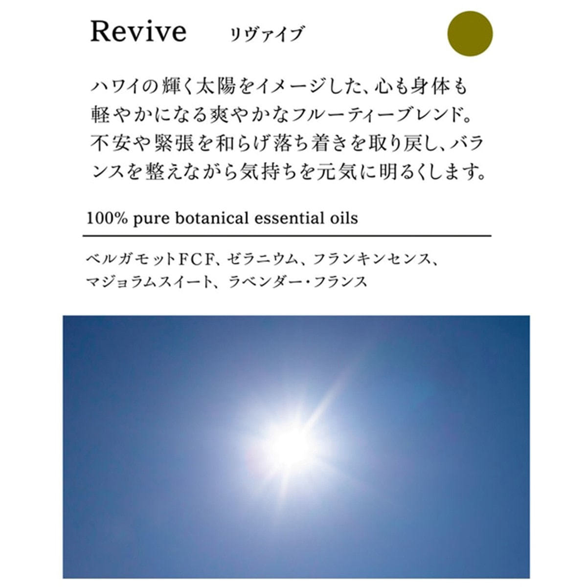 ●100%天然精油の香り:ベルガモットFCF、ゼラニウム、フランキンセンス、マジョラムスイート、ラベンダー・フランス