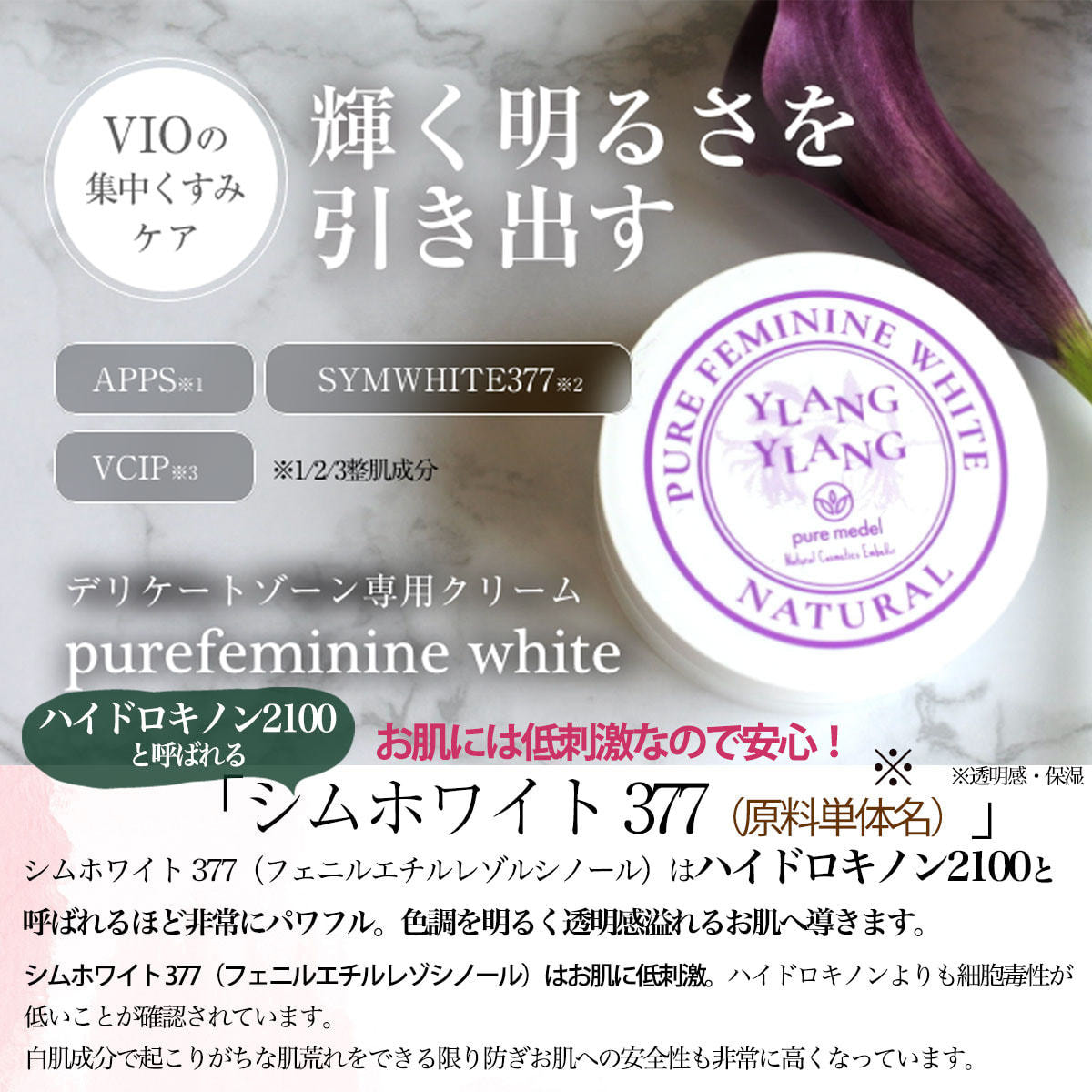 VIO専用ホワイトクリーム。ハイドロキノン2100と呼ばれお肌の色調を明るく導き低刺激なシムホワイト377 、2種類のビタミンC誘導体、ナイアシンアミド、酒麹エキス、プラセンタエキス、レスべレラトロールを配合し肌の透明感を引き出します。
