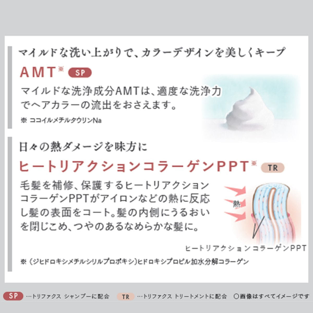 毛髪を補修、保護するヒートリアクション コラーゲンPPTがアイロンなどの熱に反応し髪の表面をコート。髪の内側にうるおいを閉じこめ、つやのあるなめらかな髪に。