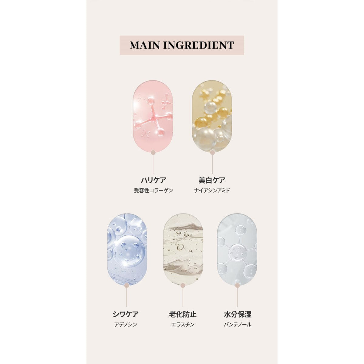 水溶性コラーゲン、プロパンジオール、1,2-ヘキサンジオール、ナイアシンアミド、スベリヒユエキス、ツボクサエキス、イチジク果実エキス、パンテノール、クエン酸Na、ヒドロキシアセトフェノン、エチルヘキシルグリセリン、アデノシン、クエン酸、水、EDTA-2Na、水添レシチン、加水分解エラスチン、加水分解コラーゲン、セラミドNP