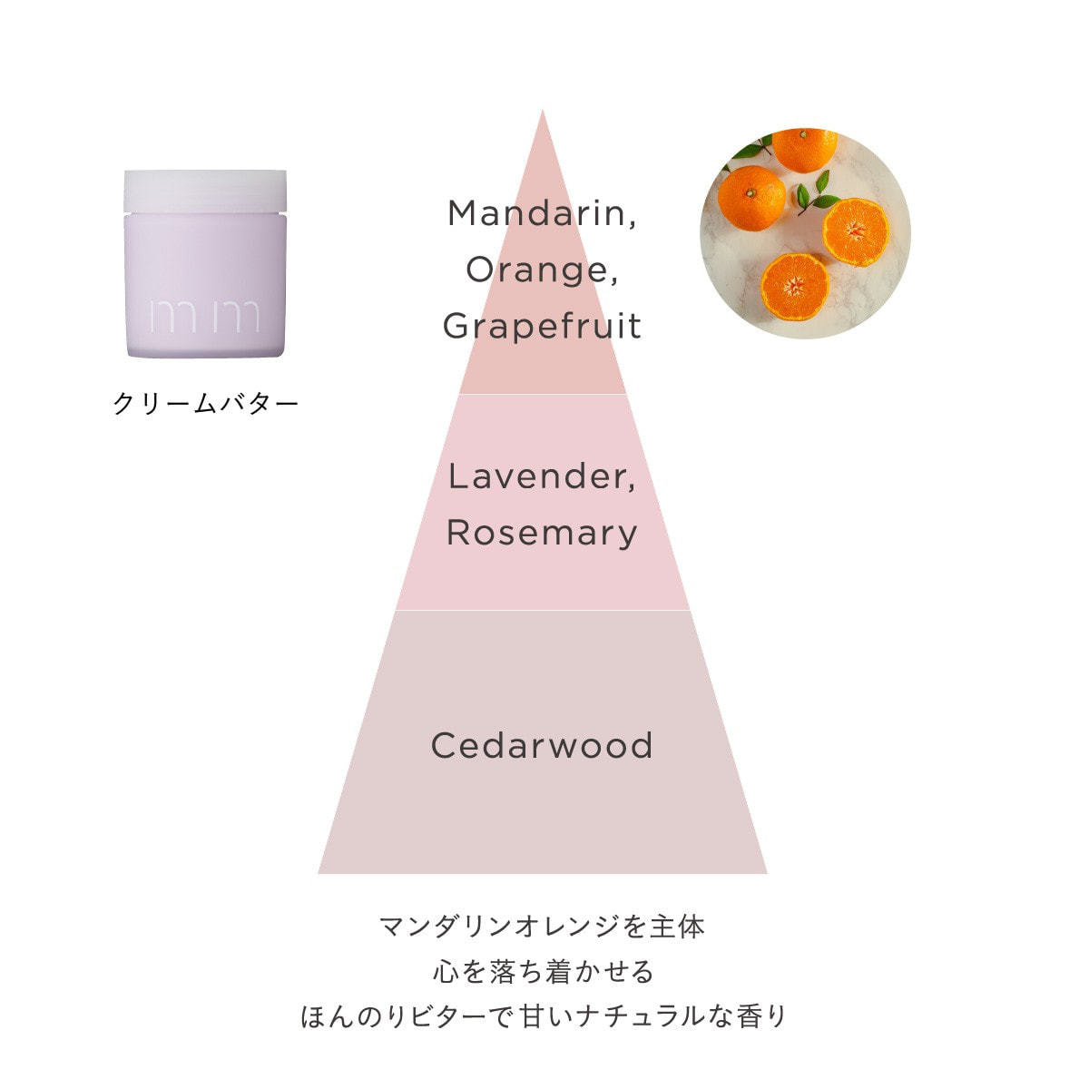 シア脂、水、アストロカリウムムルムル種子脂、ステアリン酸グリセリル、メトキシケイヒ酸エチルヘキシル、ラウリン酸イソアミル、トリ(ベヘン酸/イソステアリン酸/エイコサン二酸)グリセリル、水添ホホバ油、ホホバエステル、コメヌカ油、ドデカン、ヒマワリ種子ロウ、ショレアステノプテラ種子脂、マカデミア種子油、シルク、オクテニルコハク酸デンプンAl、フサアカシア花ロウ、BG、ポリグリセリン-3、t-ブチルメトキシジベンゾイルメタン、ペンチレングリコール、フェノキシエタノール、香料