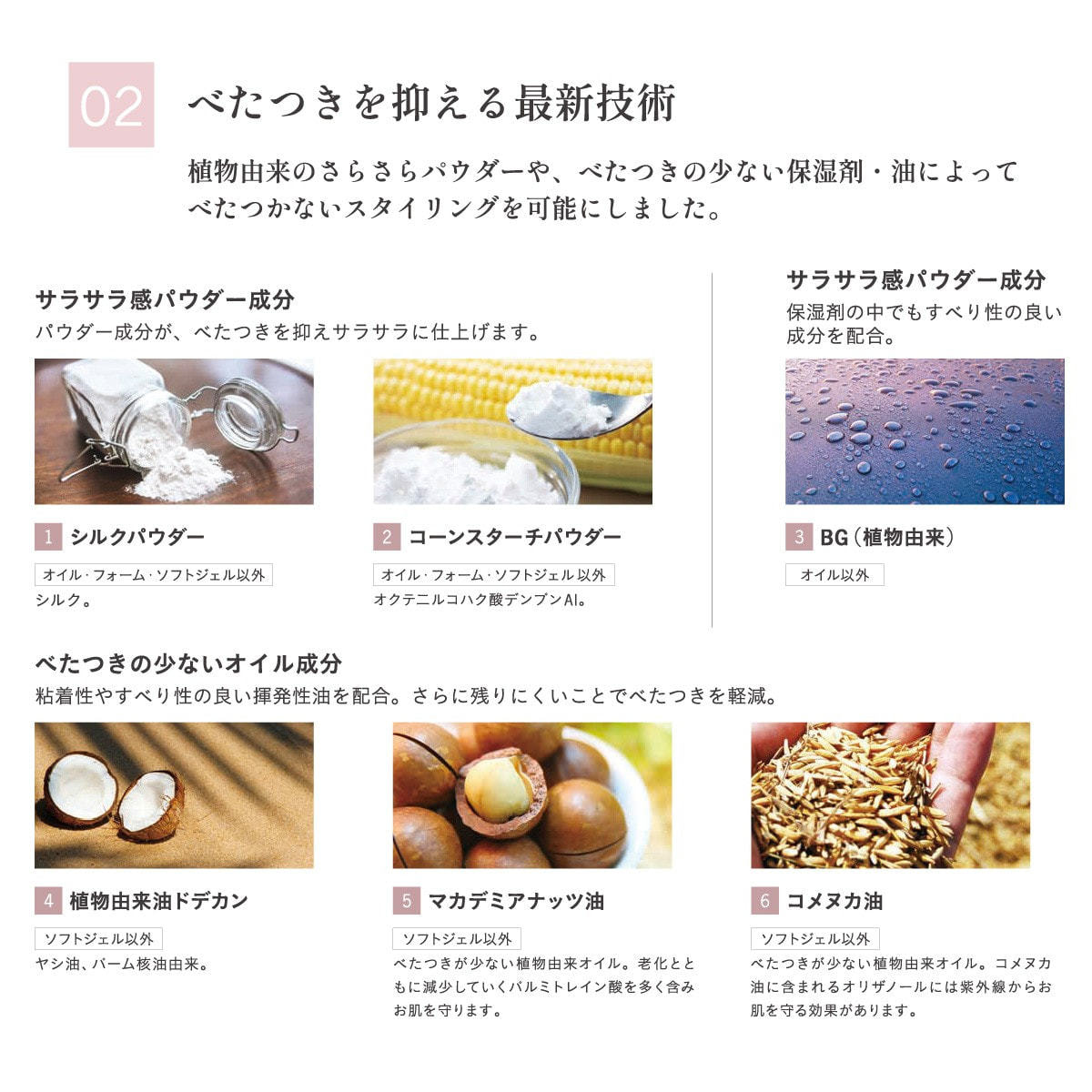 植物由来のさらさらパウダーや、べたつきの少ない保湿剤・油によってべたつかないスタイリングを可能にしました。