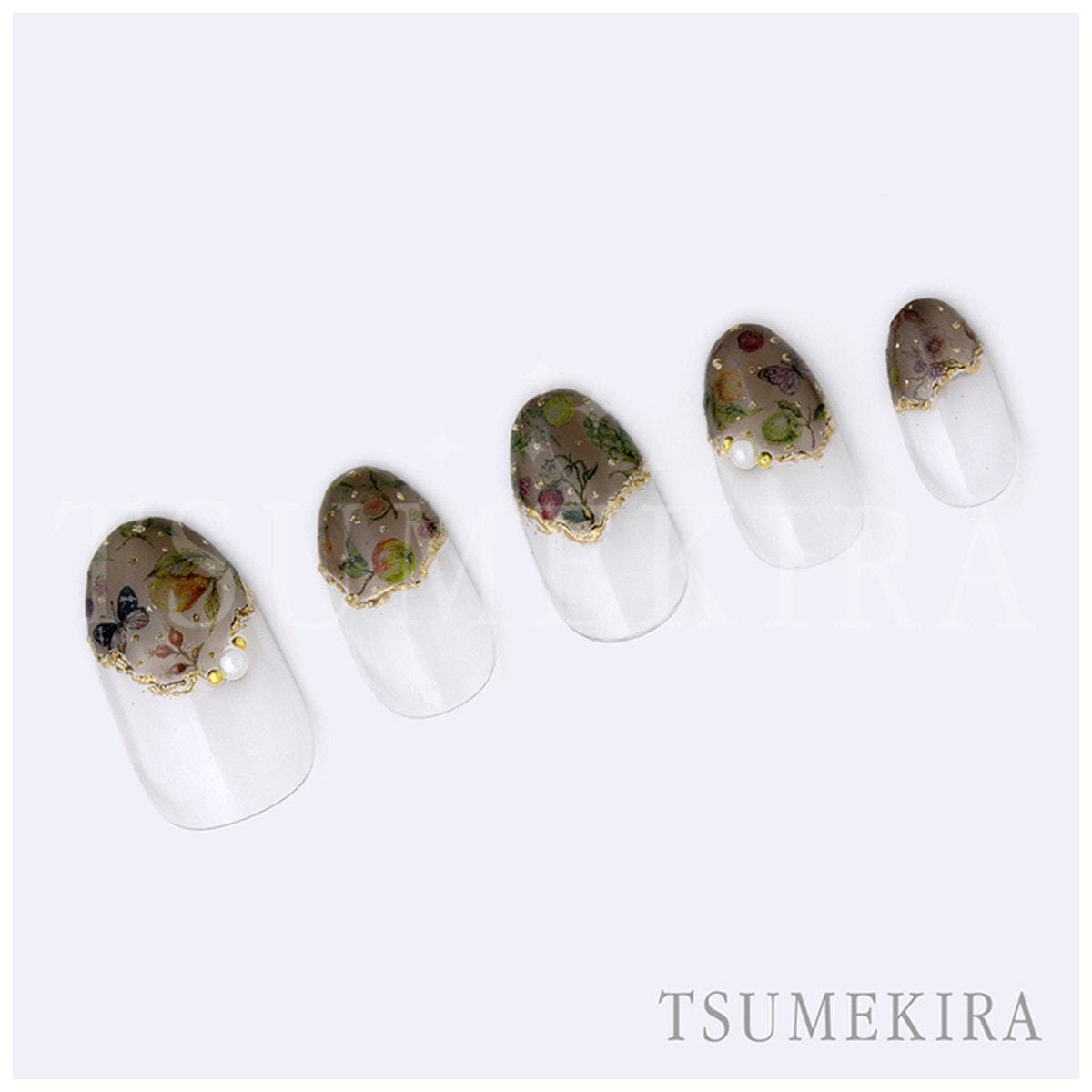瑞々しくて美味しそうなフルーツを贅沢に詰め込みました。この小さな果実たちに合わせて、小さな蝶々も7デザイン入れました。