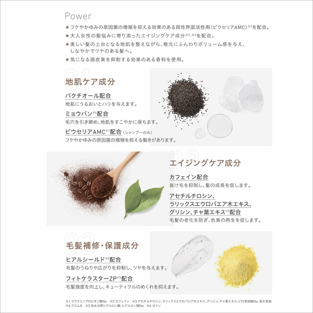 美しい髪の土台となる地肌に着目し、髪悩みの根本にアプローチしたスキンケア発想のヘアケアブランド。 若々しい輝きのある髪と地肌のためのいエイジングケア成分を贅沢に配合し、変化にゆるがない「あの頃の髪への再生」を促します。