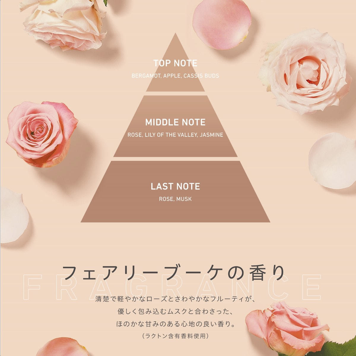 ・フィトケラスターZP※4配合:毛髪強度を向上し、キューティクルのめくれを抑えます。 ※3:加水分解ヒアルロン酸、ヒアルロン酸Na ※4:ゼイン 【香り】 ■フェアリーブーケの香り 清楚で軽やかなローズとさわやかなフルーティが、優しく包み込むムズクと合わさった、ほのかな甘みのある心地よい香り。 (ラクトン含有香料使用)