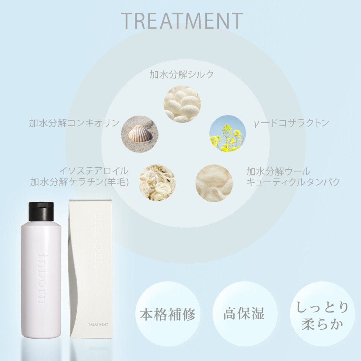 本来、inborn(生まれ持った状態)が髪にとって最高な状態と考え、ハイダメージの髪であっても、本来の健康毛に近づけることをテーマに美容師と共同研究を重ねて作り上げたヘアケアブランドです。