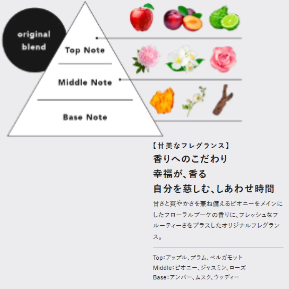 甘さと爽やかさを兼ね備えるピオニーをメインにしたフローラルブーケの香りに、フレッシュなフルーティーさをプラスしたオリジナルフレグランス。