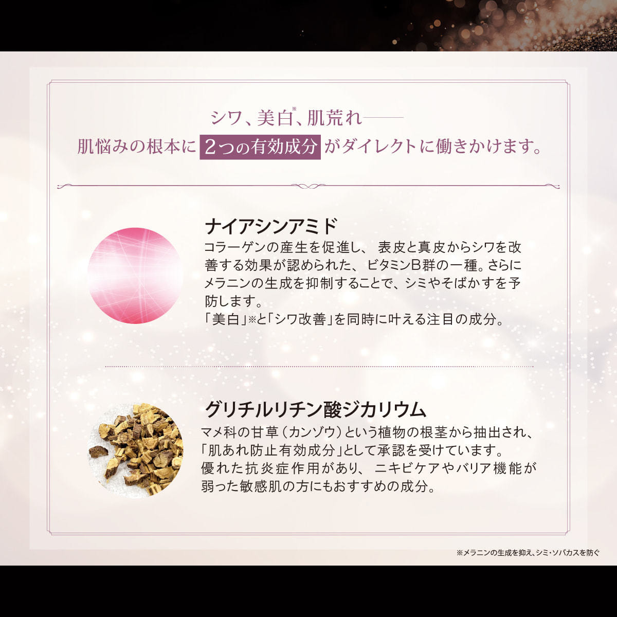 *1 メラニンの生成を抑え、シミ・ソバカスを防ぐ *2 肌荒れ予防