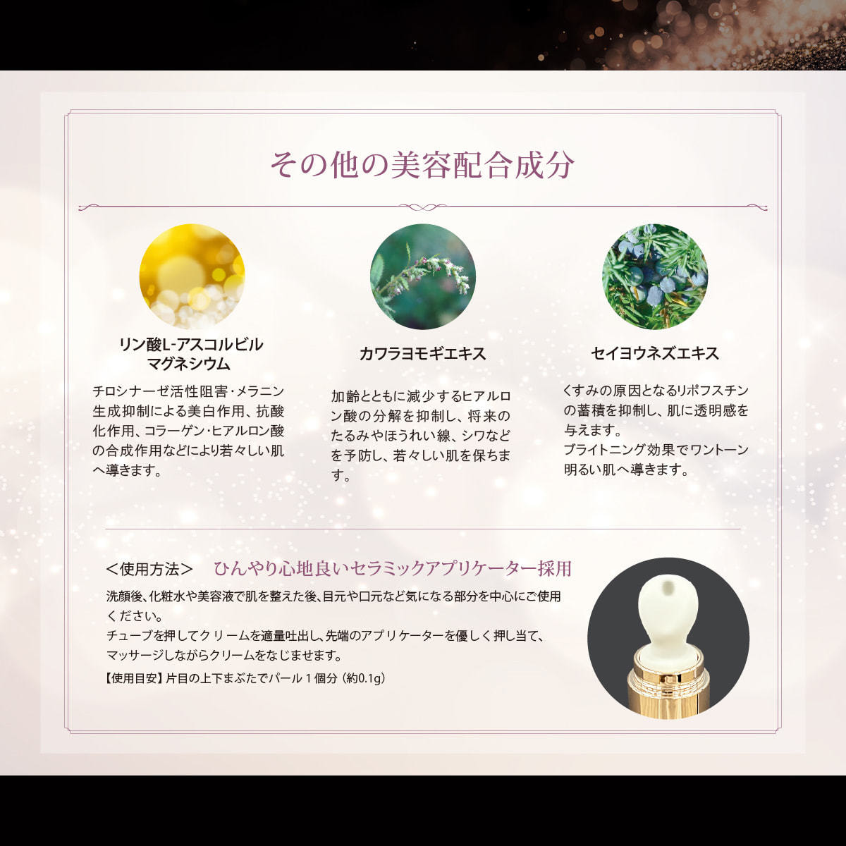 洗顔後、化粧水や美容液で肌を整えた後、目元や口元など気になる部分を中心にご使用ください。