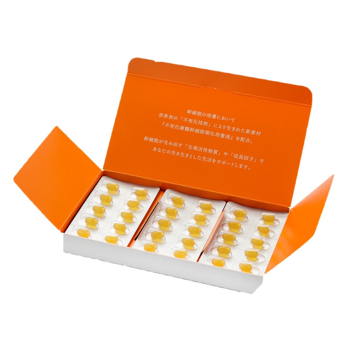 最新の再生医療技術から生まれた国際特許成分「不死化歯髄幹細胞培養上清液」を配合した体の内側から若返りをサポートするカプセルです。