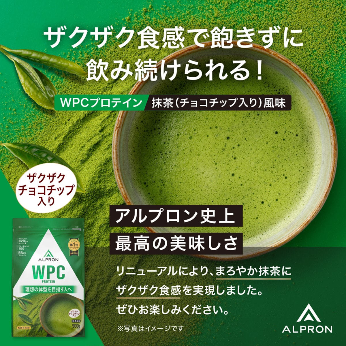 商品名:ALPRON WPC(ホエイプロテイン)抹茶風味(チョコチップ入り) 900g