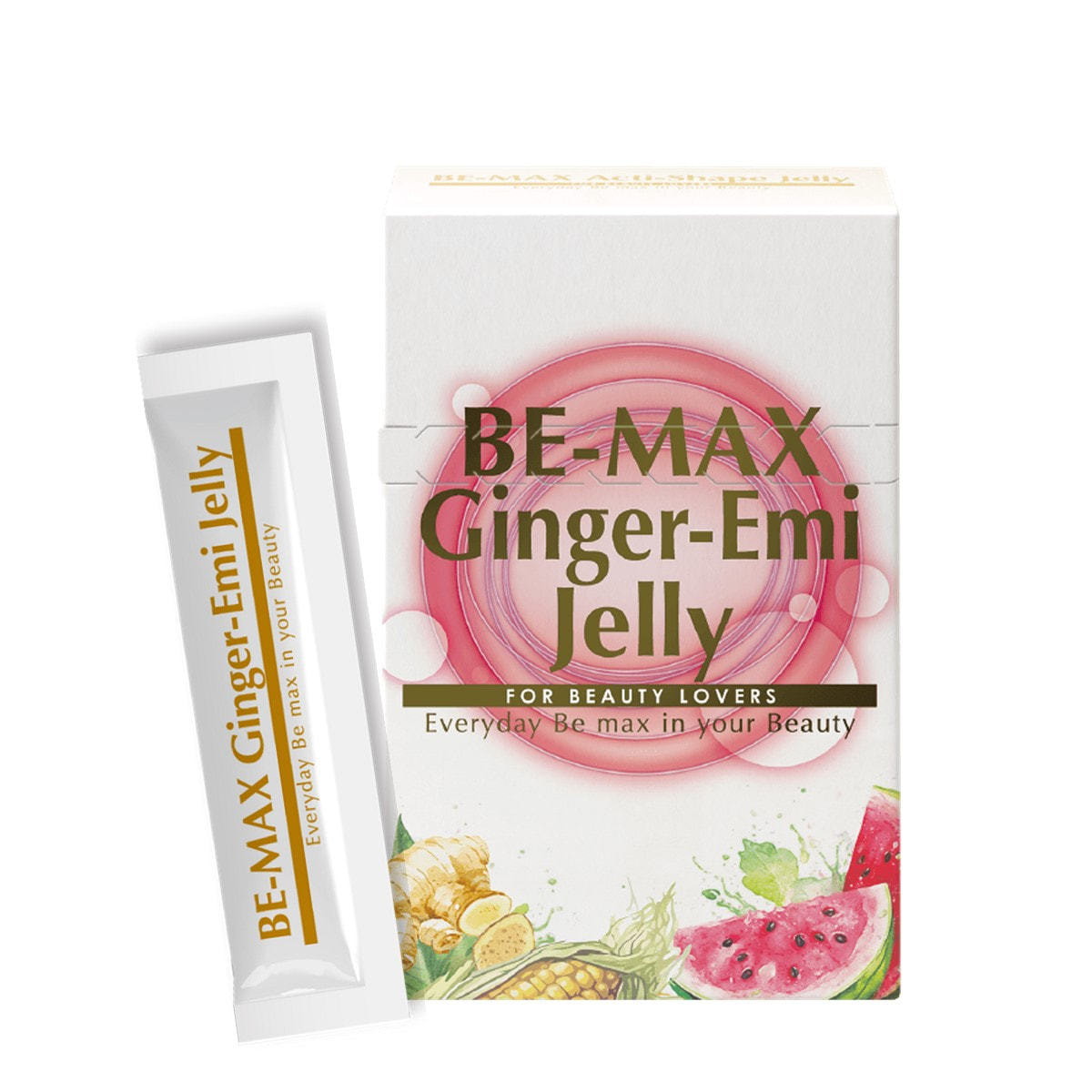 BE-MAX Ginger-Emi Jellyはスイカをはじめとしたウリ科の植物に多く含まれるアミノ酸「L-シトルリン」を中心にジンジャーエキス、コーンシルクエキス、植物抽出エキスなどを配合。