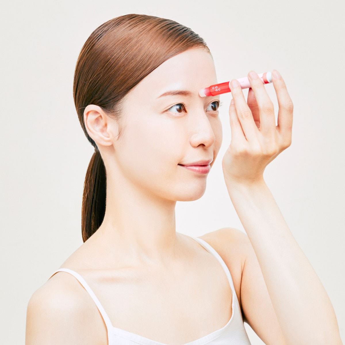 1.化粧水の後、キャップを外し、気になる部分に容器先端を肌に垂直に軽く押し当てます。