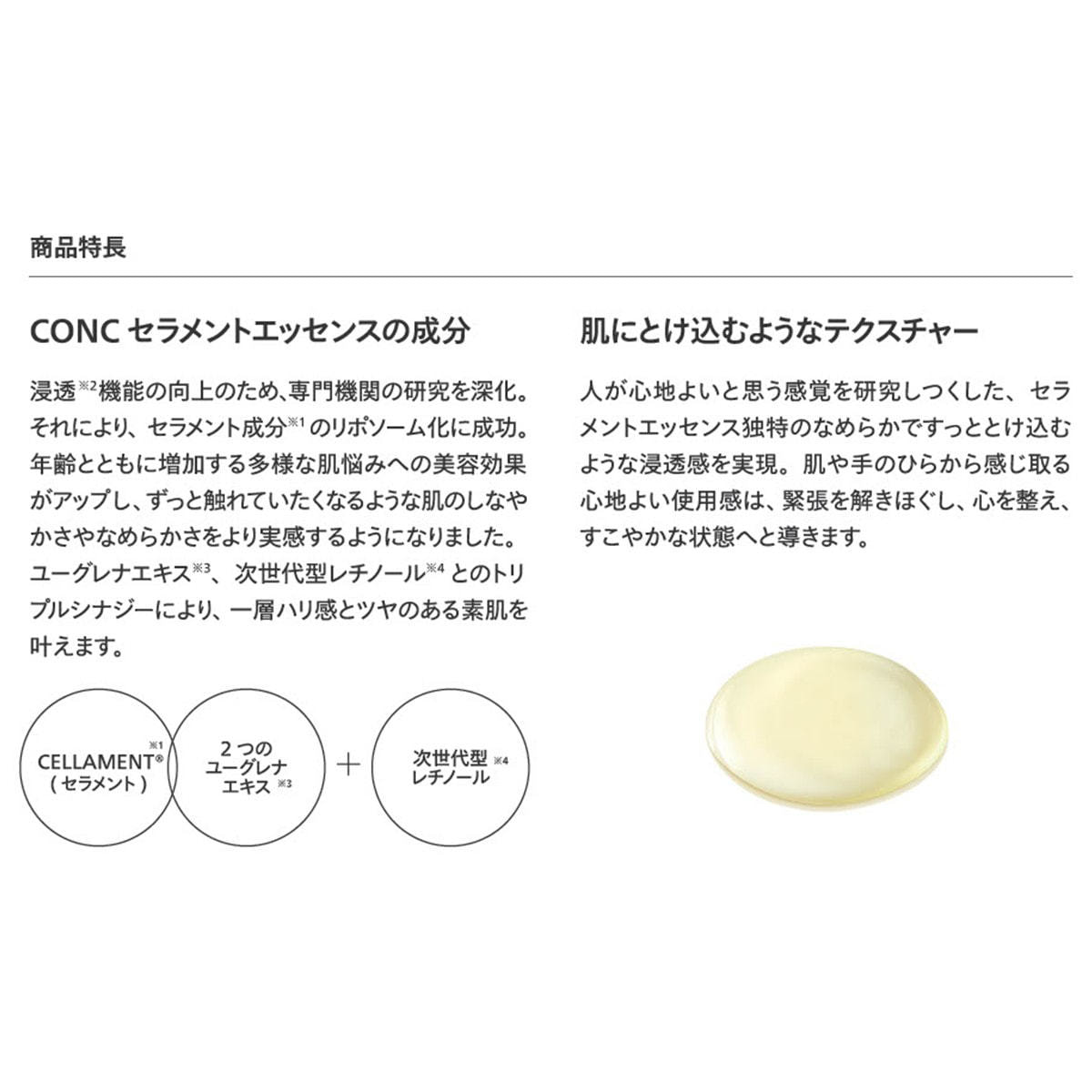 1.世界初*²『CELLAMENT®(セラメント)』配合で肌本来の持つしなやかさを引き出し、まるで子供の肌に触れたときに感じるようなふっくらとしたハリと潤いをもたらします。