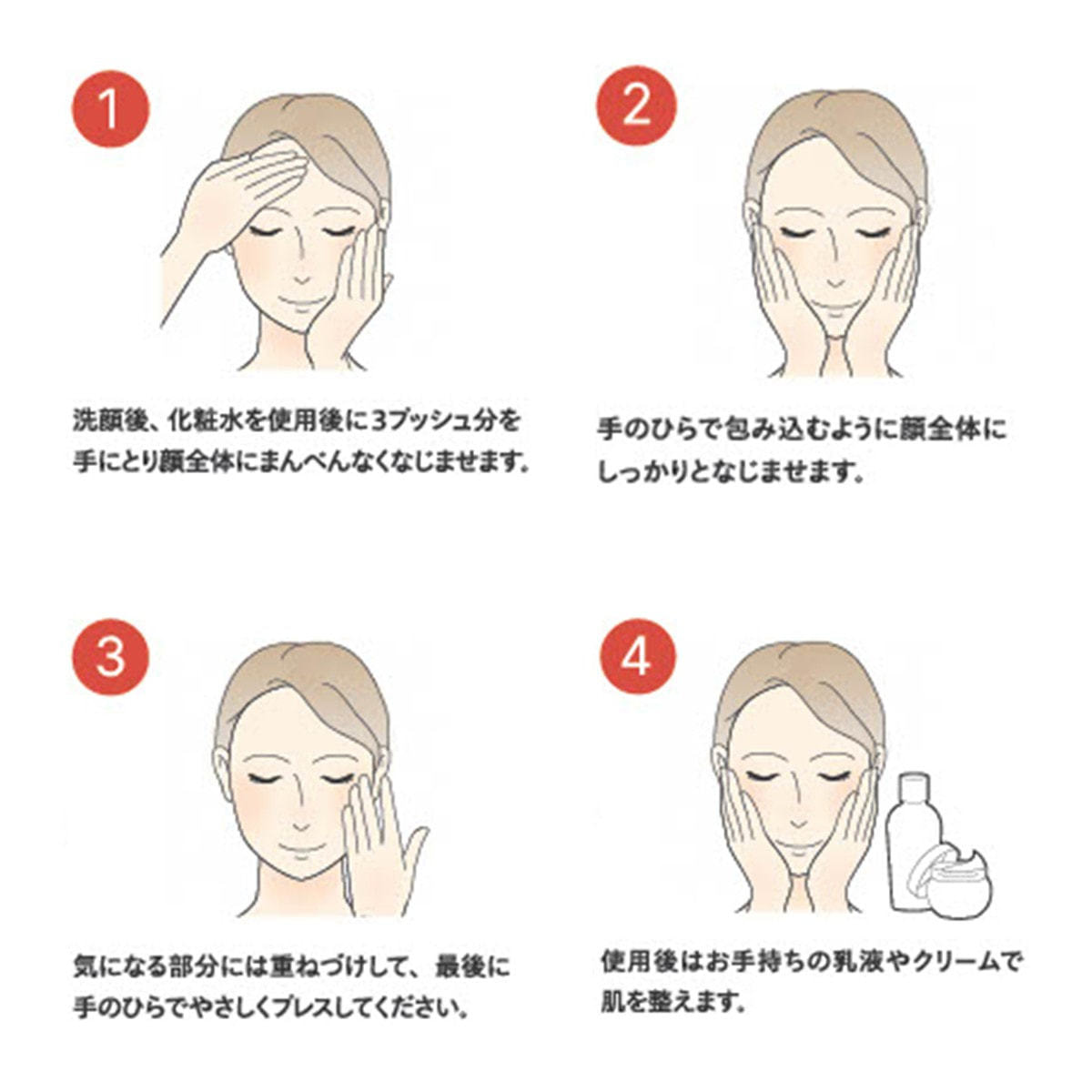 1. 洗顔後、化粧水をご使用後に3プッシュ分を手にとり、顔全体にまんべんなくなじませます。