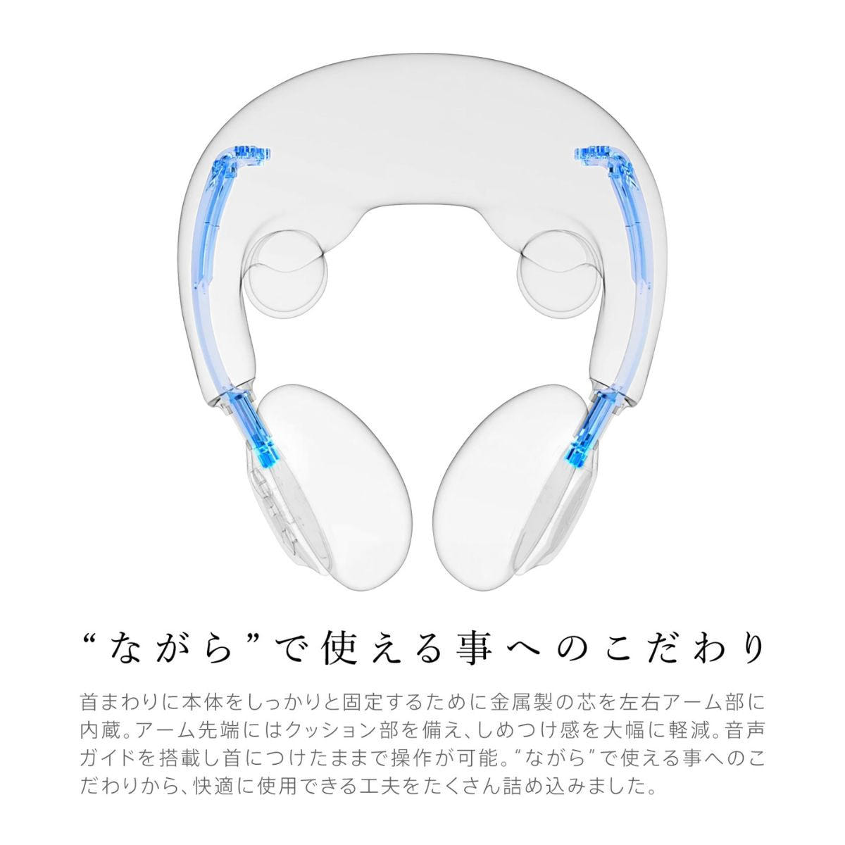 アーム先端にはクッション部を備え、 しめつけ感を大幅に軽減し、音声ガイドを搭載なので首につけたままで操作が可能です。