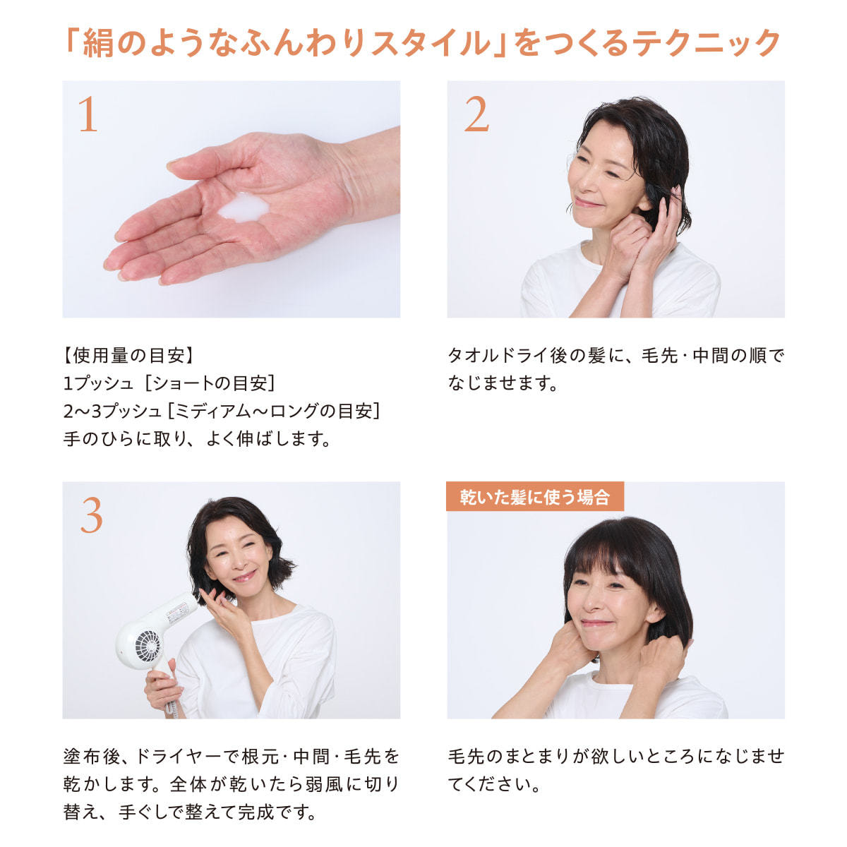 髪の芯からハリコシをあたえ、補修。髪の水分・油分バランスを整え、なめらかで触り心地のよい髪へ。