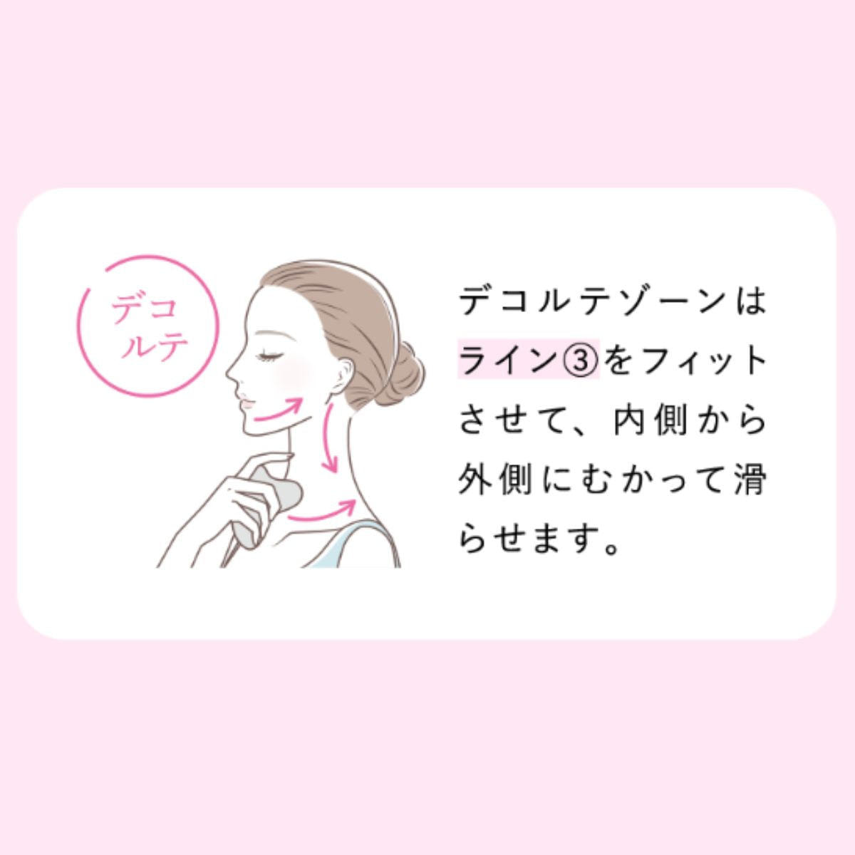 デコルテゾーンはライン③をフィットさせて、内側から外側にむかって滑らせます。