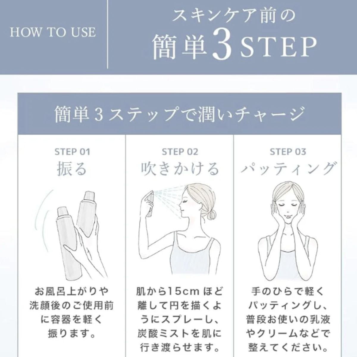 ②肌から15cmほど離して円を描くようにスプレーし、炭酸ミストを肌に行き渡らせます。