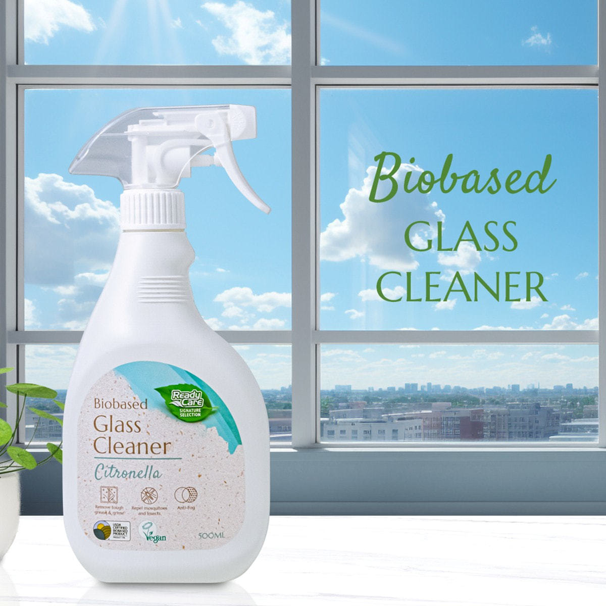頑固なグリースや汚れを除去、家や昆虫を寄せ付けないバイオベース処方のガラスクリーナー。