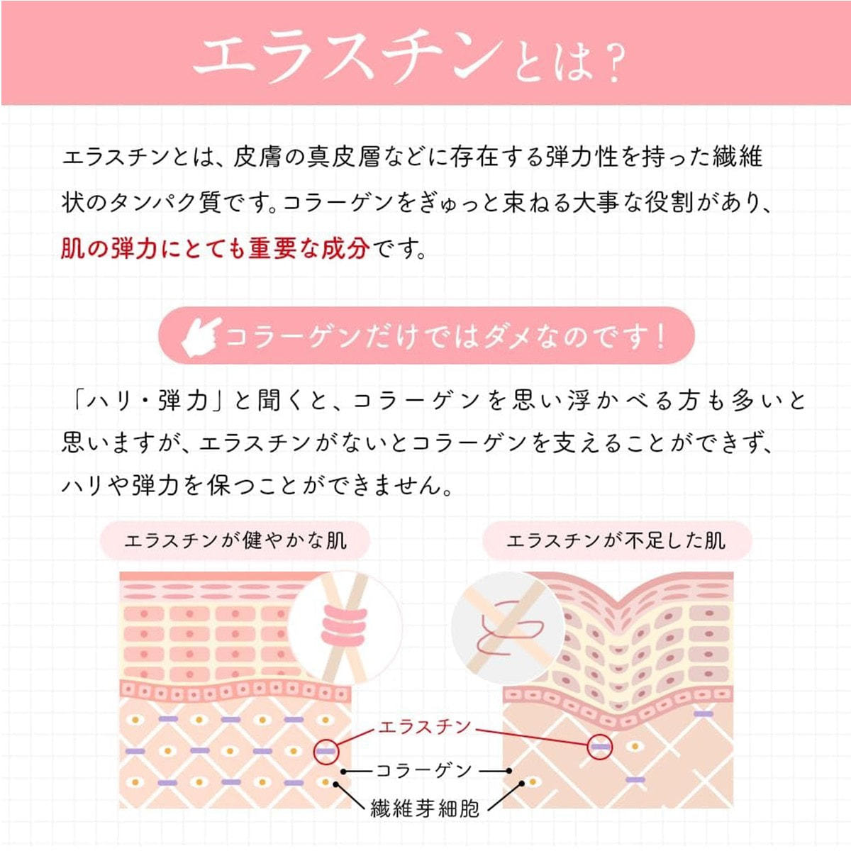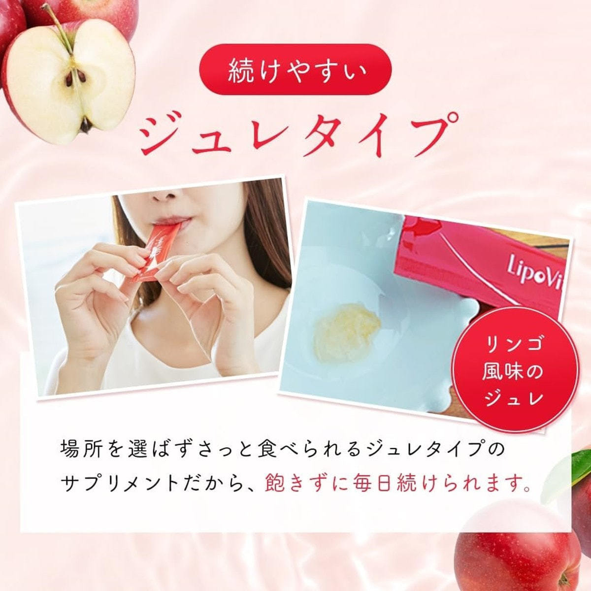 リンゴ果汁(国内製造)、グリセリン、リン脂質、水溶性エラスチン、培養リンゴ抽出物(イソマルトオリゴ糖、培養リンゴエキス)デキストリン、プロテオグリカン含有サケ鼻軟骨抽出物/香料、ゲル化剤(増粘多糖類)、グレープフルーツ種子抽出物、酸味料、甘味料(スクラロース)